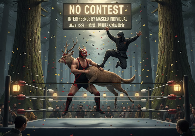 鹿vs俺・15分一本勝負、覆面の乱入で無効試合。